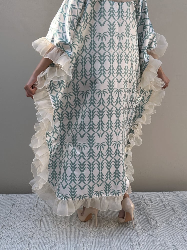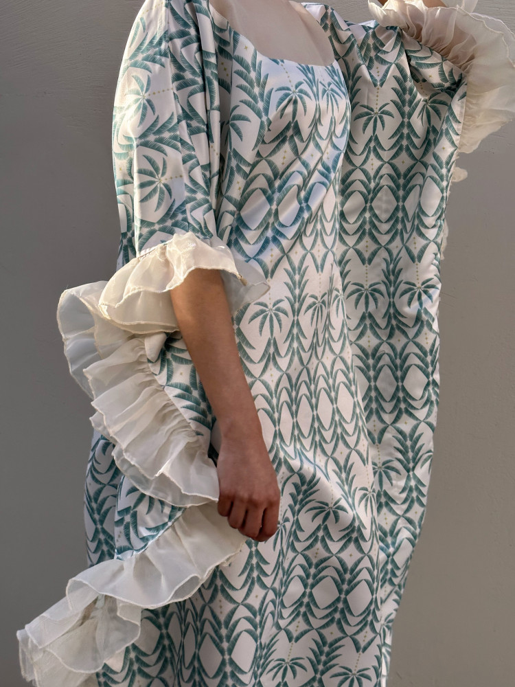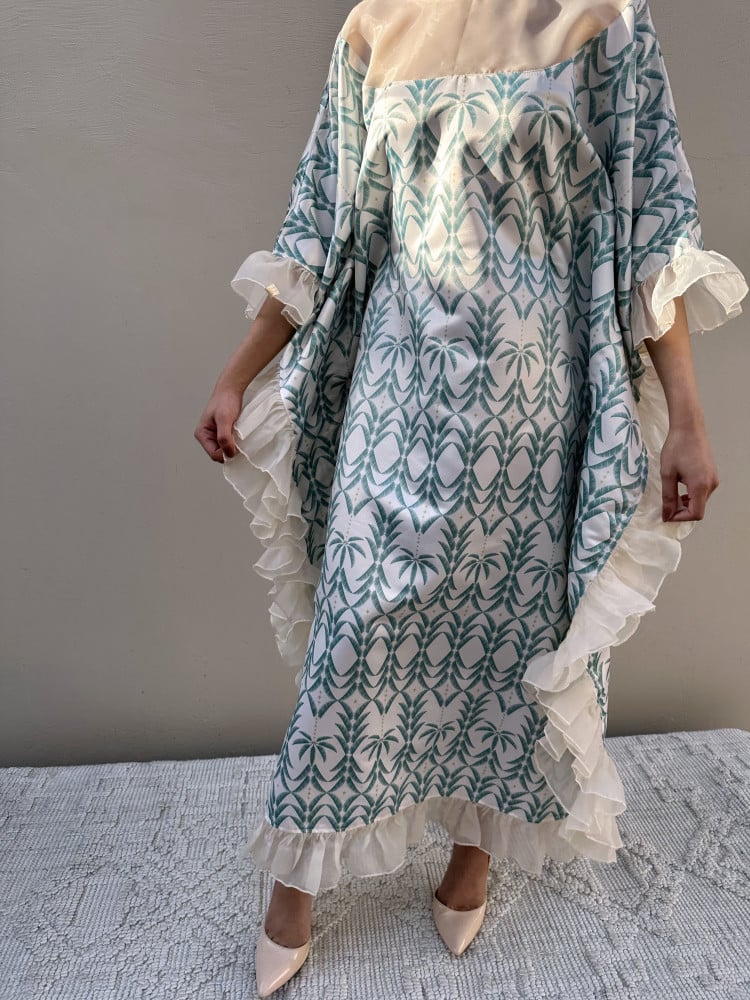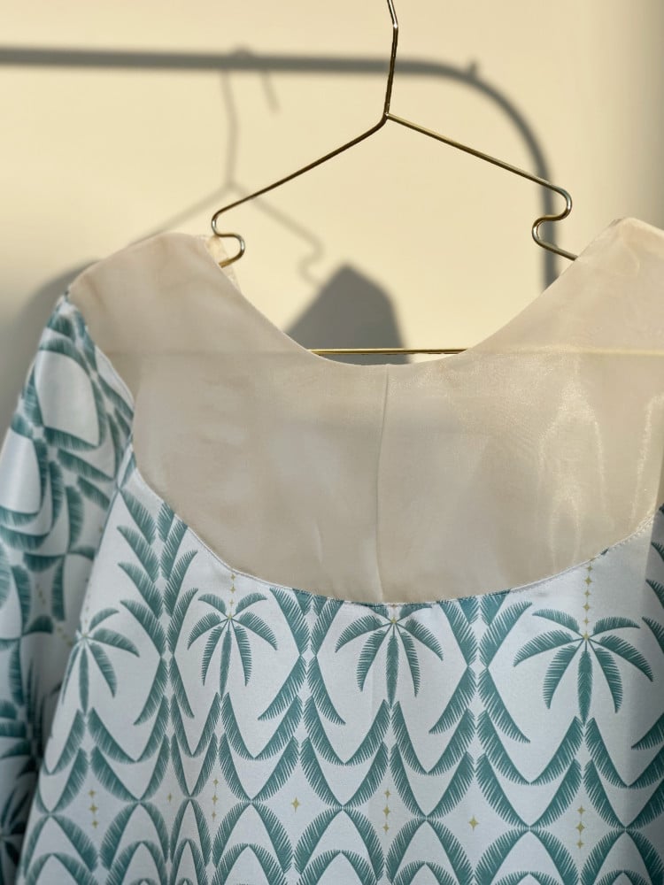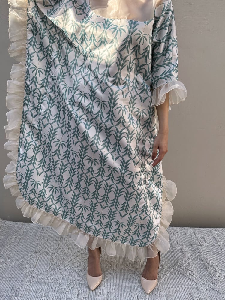 جلابية بطباعة مستوحاة من سعف النخل بقياس واحد مع حزام مخفي لتلائم جميع المقاسات.