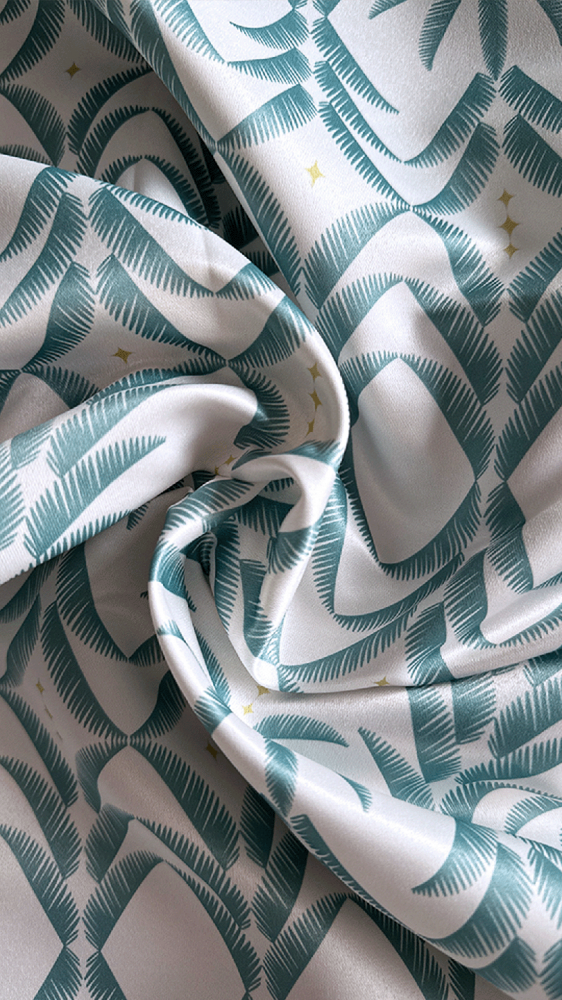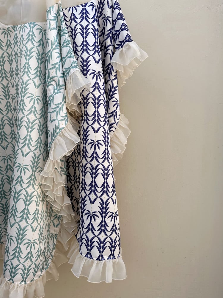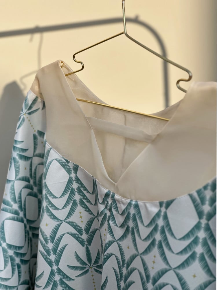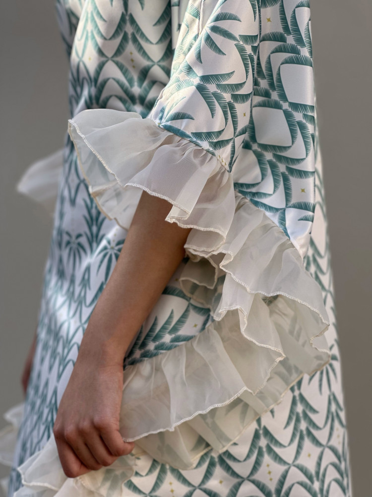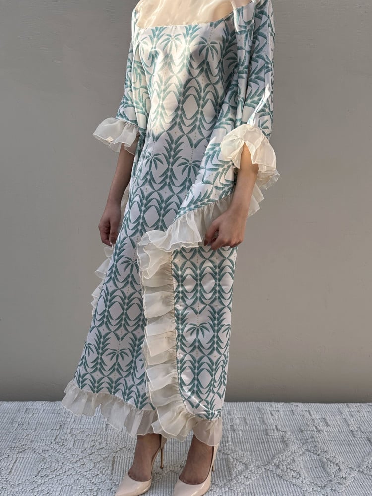 جلابية بطباعة مستوحاة من سعف النخل بقياس واحد مع حزام مخفي لتلائم جميع المقاسات.